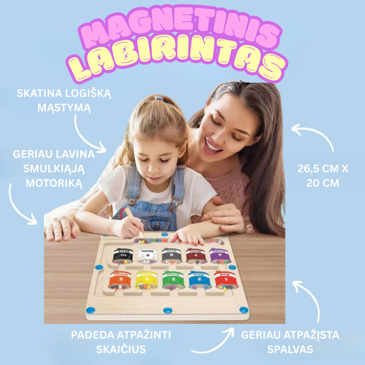 Naudodami 55 magnetinius karoliukus 10 ryškių spalvų, vaikai magnetine lazdele nukreipia kiekvieną karoliuką į atitinkamą dažų skardinę. Ši įtraukianti veikla stiprina rankų ir akių koordinaciją, smulkiąją motoriką ir loginį mąstymą. Kiekvienas judesys yra žaismingas žingsnis link mokymosi.